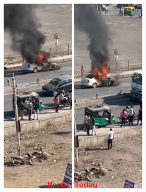 મોરબીની મહેન્દ્રનગર ચોકડીએ અચાનક આગ લગતા કાર બળીને ખાખ