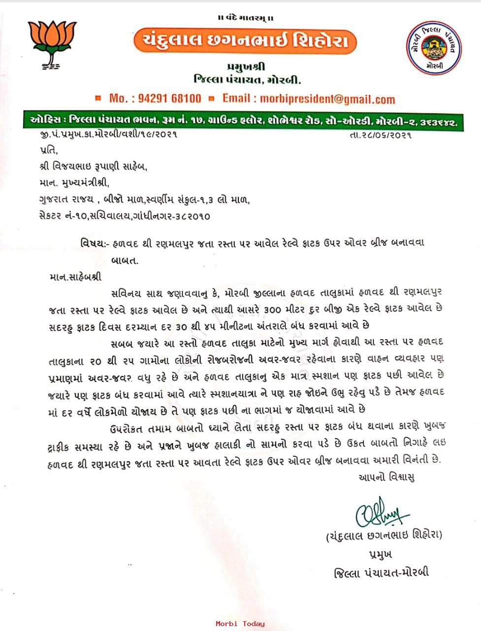 Read Moreમોરબી જિલ્લા પંચાયતના પ્રમુખ દ્વારા સીએમને રજૂઆત કરીને હળવદના રણમલપુર અને ટીકર જવાના માર્ગે રેલવે ફાટક ઉપર ઓવરબ...